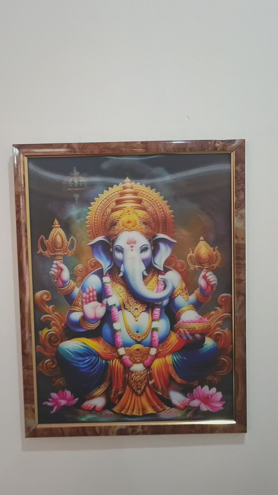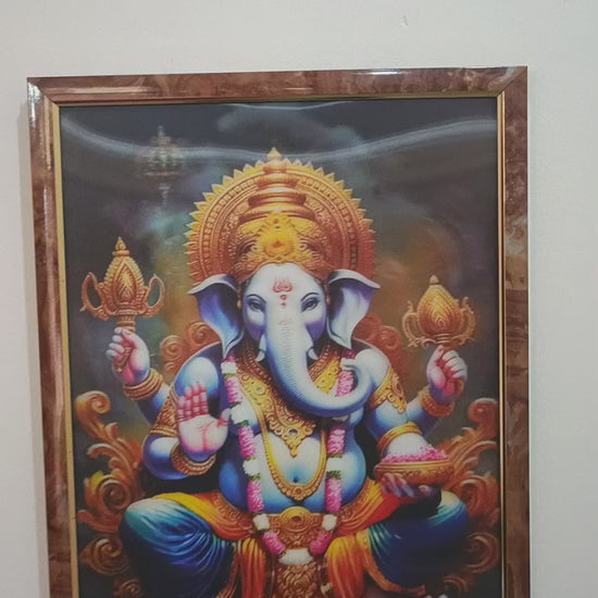 This 3D lenticular painting measures 12x16 inches, with a fun depth effect that makes the scene look real and deep from any side. This serene art shows Lord Ganesha sitting peacefully, with his elephant head, holding a modak in one hand and a broken tusk in the other. The background features a warm orange glow and green leaves. Great for home decor, prayer rooms, or gifts, this framed piece brings holy wisdom and nice style to any spot. Made with good materials that last long. Best for fans of special Hindu god pictures.