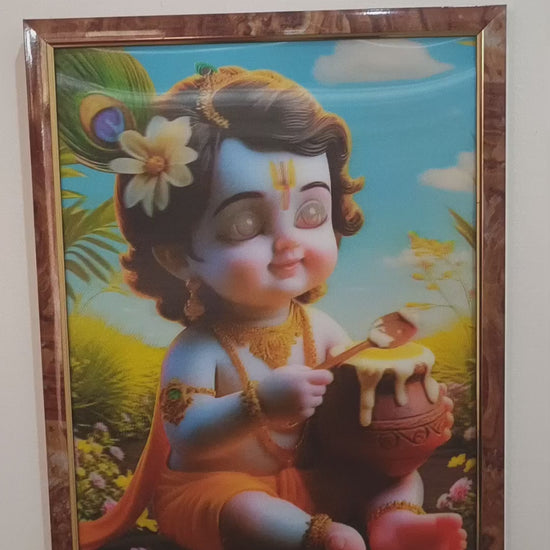 This 3D lenticular painting measures 12x16 inches, with a fun depth effect that makes the scene look real and deep from any side. See the magic eye opening and closing effect as baby Krishna seems to blink with joy when you move your view. This lovely art shows baby Krishna sitting happily, holding a pot of butter with a spoon, wearing a peacock feather and flower crown. The background has a bright blue sky, green grass, and colorful flowers. Great for home decor, prayer rooms, or gifts, this framed piece brings holy joy and nice style to any spot. Made with good materials that last long. Best for fans of special Hindu god pictures.