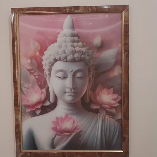 Transform your space with this enchanting Animated Buddha Framed Art, a stunning piece that radiates peace and spirituality. This artwork showcases a serene Buddha statue holding a lotus flower, surrounded by vibrant pink blooms and a mystical pink backdrop, symbolizing purity and enlightenment. The unique eye-moving effect allows the eyes to appear to close and open from different angles, adding a mesmerizing touch to this divine creation. Perfect for meditation corners, living rooms, or as a spiritual gift, it seamlessly blends artistry with tranquility.