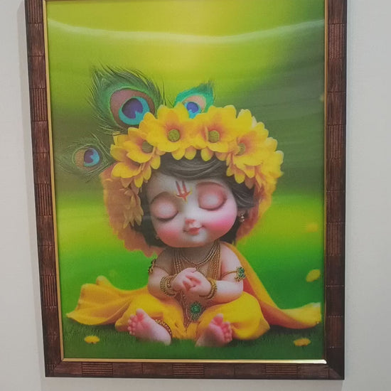 This 12x16 inches 3D lenticular painting offers a striking depth effect, showcasing Baby Krishna in vibrant colors. The eye-closing effect creates a shifting view, adding a magical touch as you move. Featuring a charming Krishna with a peacock feather crown and yellow attire, this artwork brings divine beauty to your space. The wooden frame enhances its elegance, making it perfect for home or temple decor. Easy to hang, this 3D painting is ideal for devotees and art lovers seeking a unique, spiritual piece