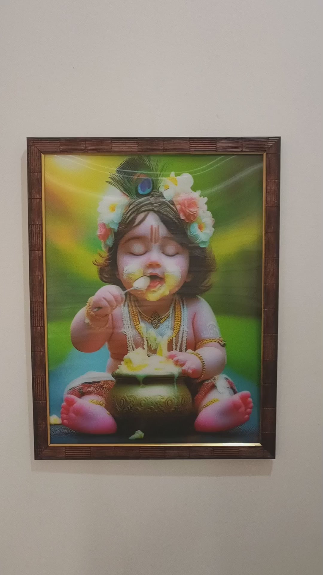 This 12x16 inches 3D lenticular painting offers a charming depth effect, featuring Baby Krishna mischievously eating makkhan. The eye-closing effect creates a playful shift, capturing his joyful expressions as you move. Set against a vibrant village backdrop, this artwork brings a touch of divine childhood to any space. The wooden frame adds elegance, making it perfect for home or nursery decor. Easy to hang, this 3D painting is ideal for devotees and art lovers seeking a unique spiritual piece.