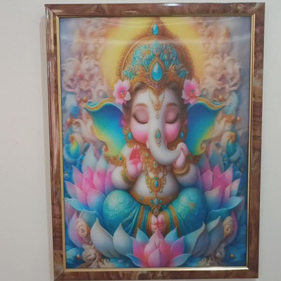 This 12x16 inches 3D lenticular painting offers a captivating depth effect, featuring Lord Ganesha with his elephant head and blessings. The eye-closing effect creates a dynamic shift, adding a sacred touch as you move. Set against a vibrant background with lotus flowers, this artwork enhances any space with divine energy. The wooden frame adds elegance, making it perfect for home or temple decor. Easy to hang, this 3D painting is ideal for devotees and art lovers seeking a unique spiritual piece.