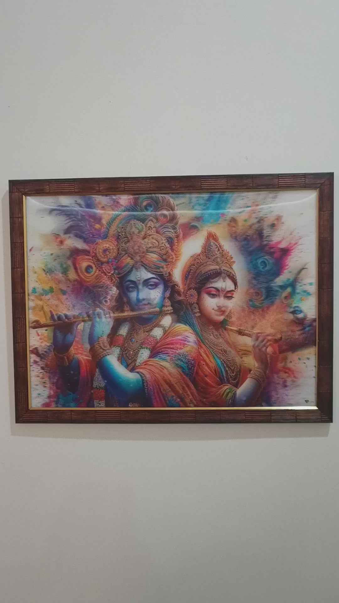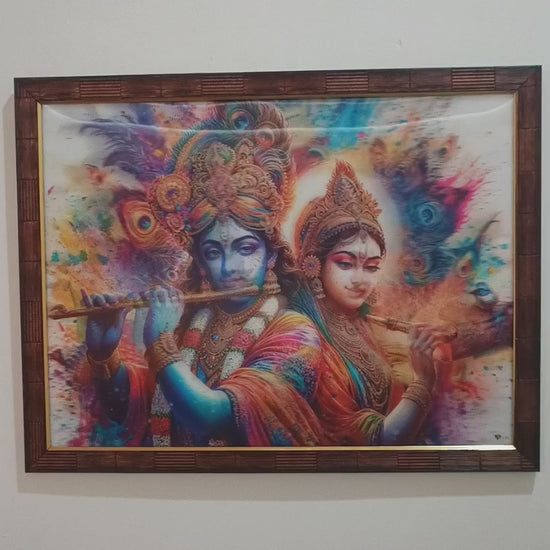 This 12x16 inches 3D lenticular painting offers a captivating depth effect, featuring Radha and Krishna in a loving pose. The eye opening and closing effect creates a magical shift, revealing different expressions as you move. With vibrant colors and a floral backdrop, this artwork adds a divine touch to your space. The wooden frame enhances its elegance, making it perfect for home or temple decor. Easy to hang, this 3D painting is ideal for devotees and art lovers seeking a unique spiritual piece.