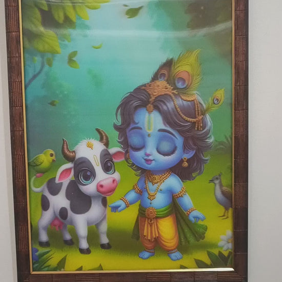 (Size: 12 x 16 inches) Elevate your space with the Krishna with Calf Framed Art. It shows young Krishna in his blue form, holding hands with a cute calf in a bright, green setting. With a peacock feather crown and gold jewelry, the 3D lenticular effect adds depth, making the figures pop out and move from different angles. Great for prayer rooms, living spaces, or as a nice gift!
